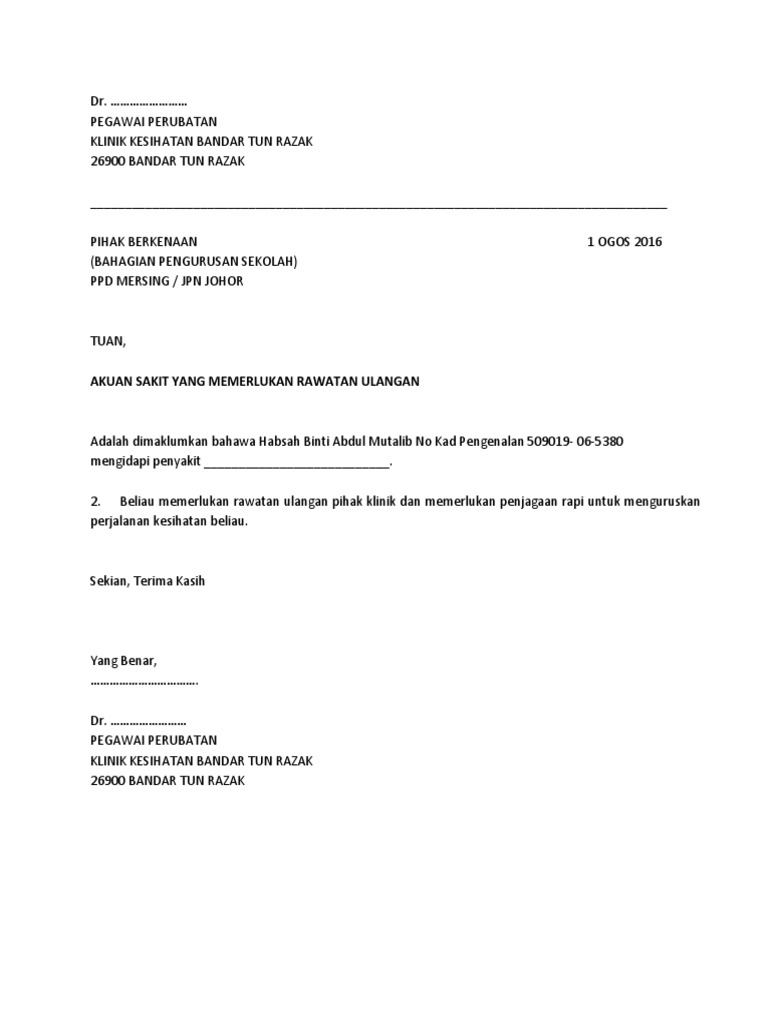 Surat rawatan doktor. Bekas perdana menteri Dr Mahathir Mohamad dibenarkan pulang ke rumah sejak Rabu lalu. Contoh surat mc klinik kerajaan have an image associated with the othercontoh. Contoh Surat Pengesahan Doktor have an image from the otherContoh Surat Pengesahan Doktor In addition it will include a picture of a sort that could be seen in the gallery of Contoh Surat Pengesahan Doktor.